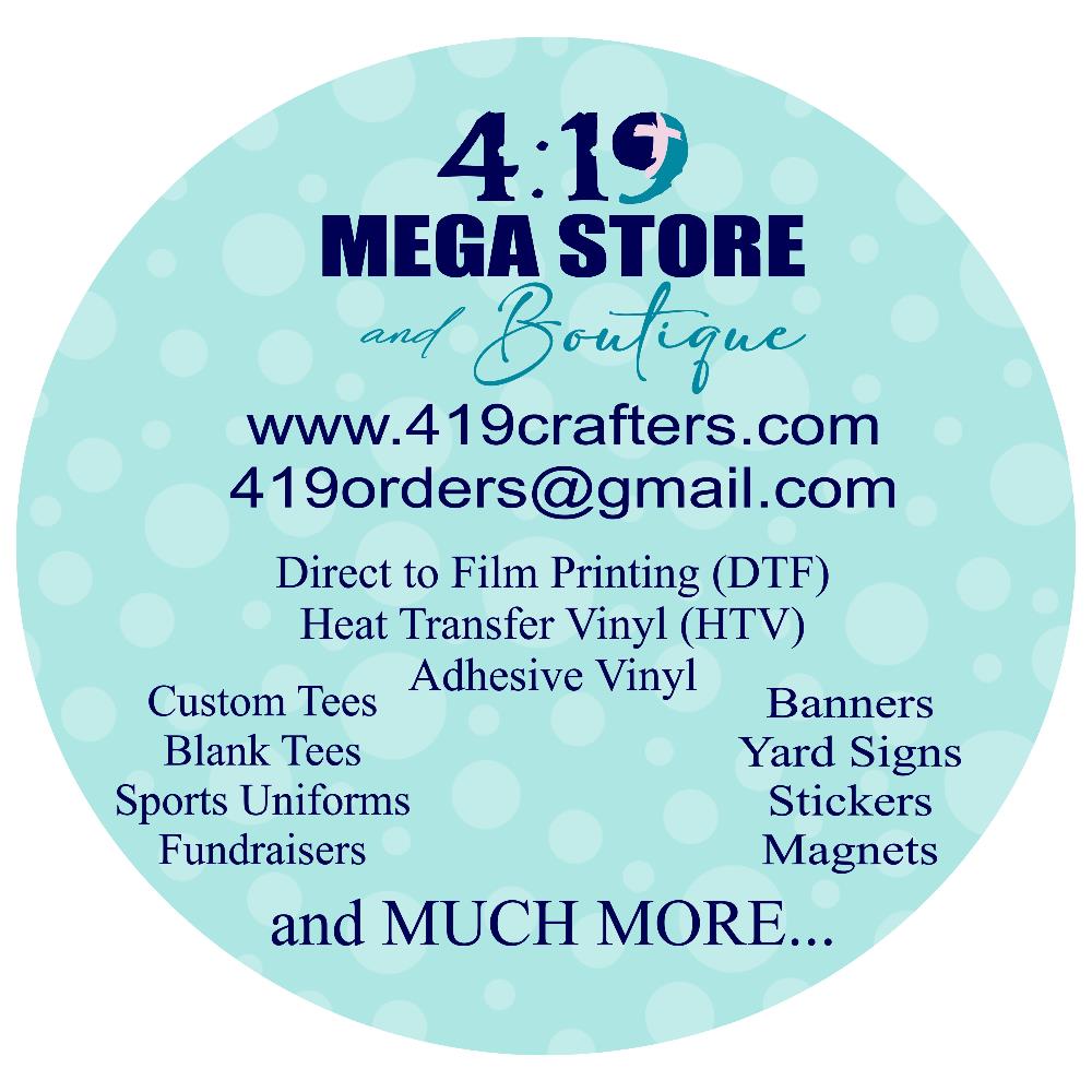 At 4:19 MEGA STORE and Boutique, we pride ourselves on being your go-to destination for personalized products, specialty printing, and boutique finds. Whether you’re looking for custom apparel, promotional items, or unique gifts, we have you covered with quality, creativity, and service that stands out.Custom Printing & ApparelWe specialize in a wide range of custom products, including:Custom t-shirts, banners, yard signs, stickers, decals, and fat headsSports uniforms, team apparel, and scrubsBulk orders, fundraisers, and spirit wearBlank tees and ready-to-wear graphic tees available ...